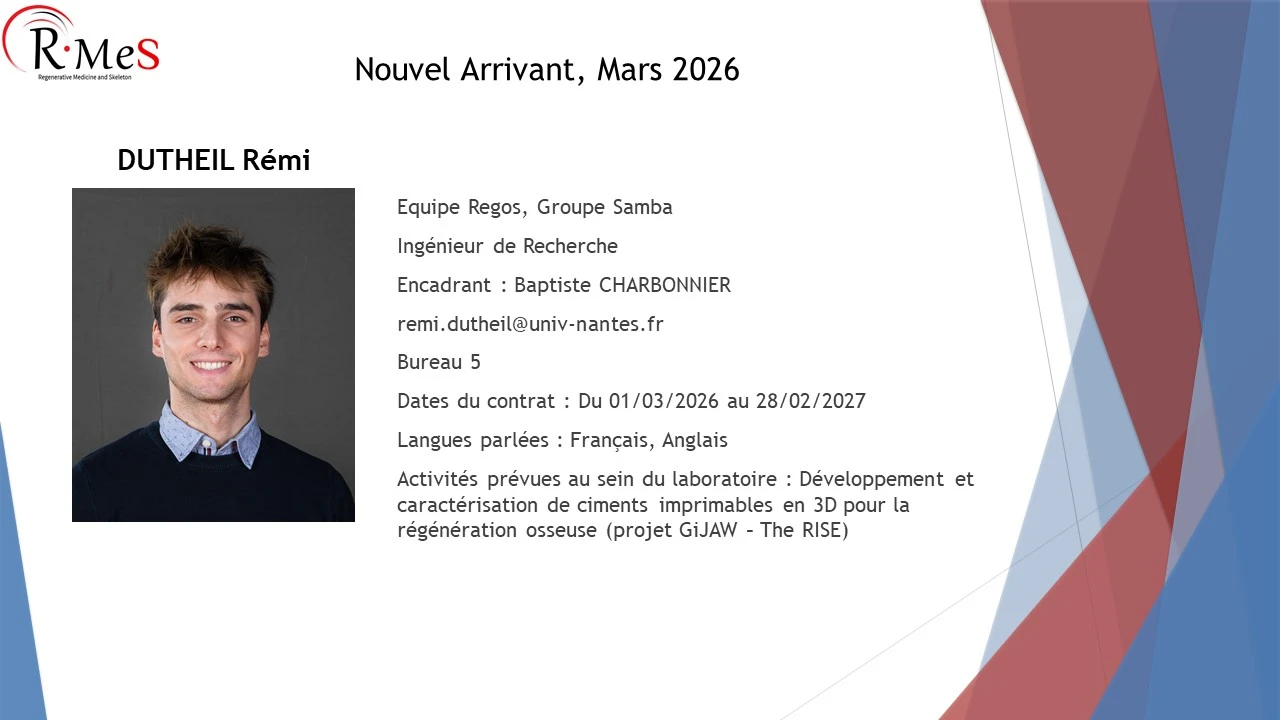Mandibular atrophy induced by the lack of a proper dentition is a major medical and socio-economic burden worldwide: the remaining bone volume is not sufficient to place dental implants to restore physiological functions. Although bone augmentation procedures exist, they are often heavy and complex, costly, and not deprived of risks (e.g., autologous bone graft). The ATIP-Avenir SAMBA program (INSERM/CNRS) will allow for the creation of a new group in RMeS Lab to tackle this issue, by developing among others 3D-printed patient specific biomimetic scaffolds for bone regeneration.